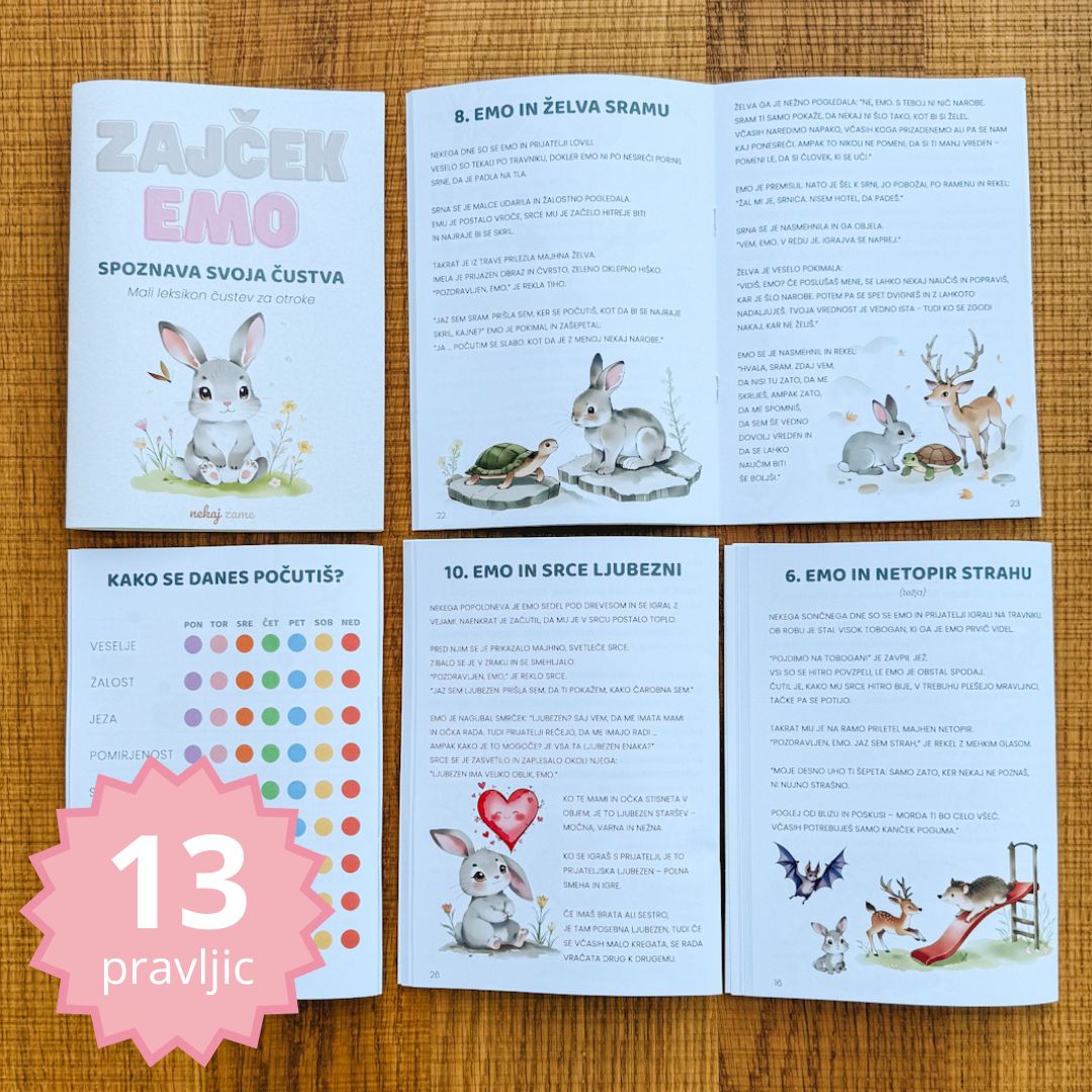 ZAJČEK EMO SPOZNAVA SVOJA ČUSTVA – mali leksikon čustev za otroke (13 pravljic + naloge – KNJIGA)