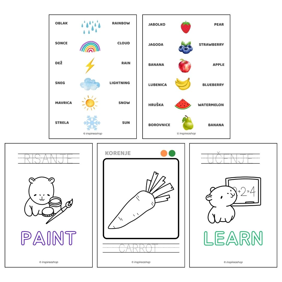 Angleščina za najmlajše je paket zabavnih učnih listov, ki otrokom na igriv način približajo osnove angleščine s slovenskimi prevodi.