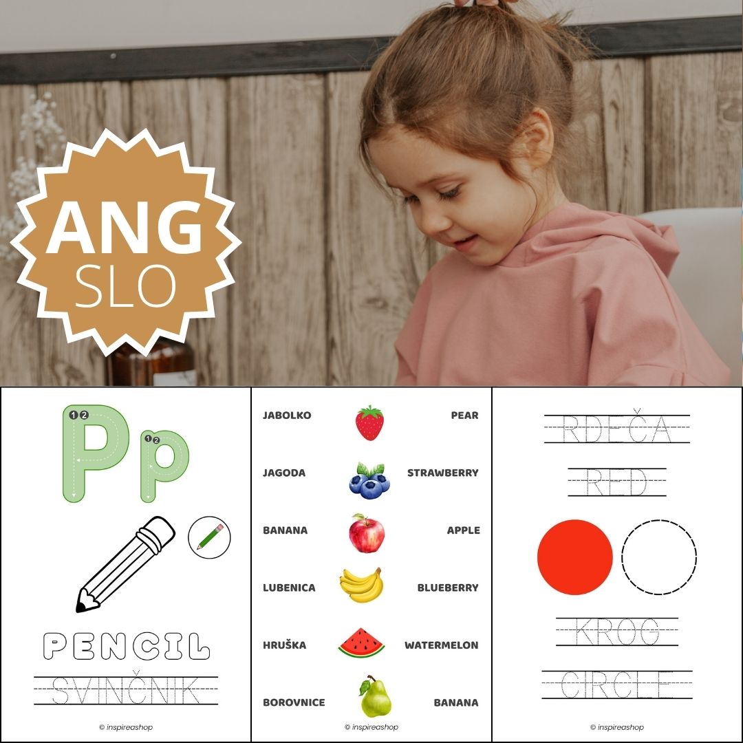 Angleščina za najmlajše – angleško slovenske vaje: abeceda, številke, barve, oblike, živali, sadje, glagoli (PDF 170 strani)