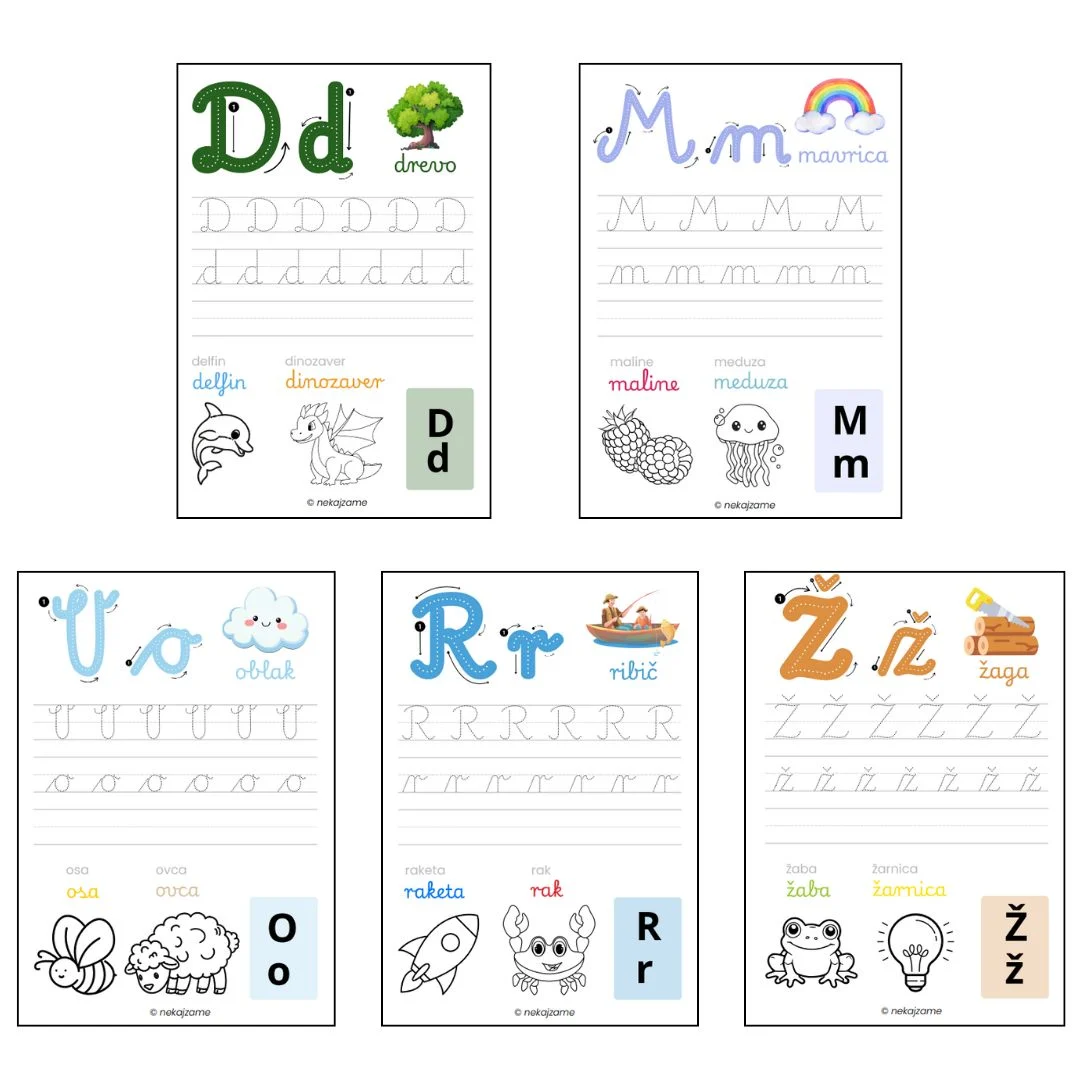 ✏️ Slovenska abeceda – pisane črke (25 strani): Samostojno pisanje črk krepi fino motoriko in pravilno držo svinčnika.