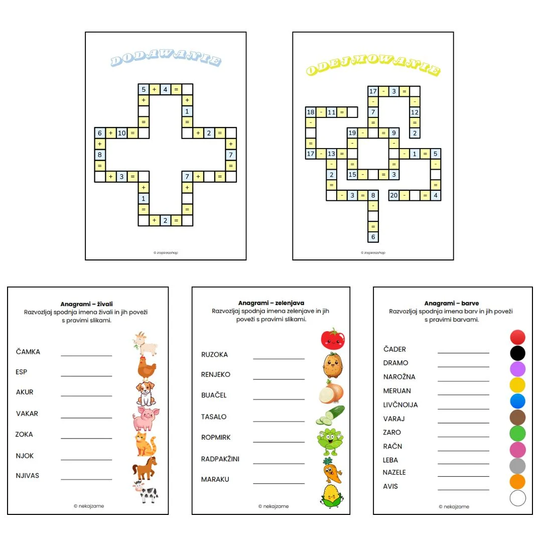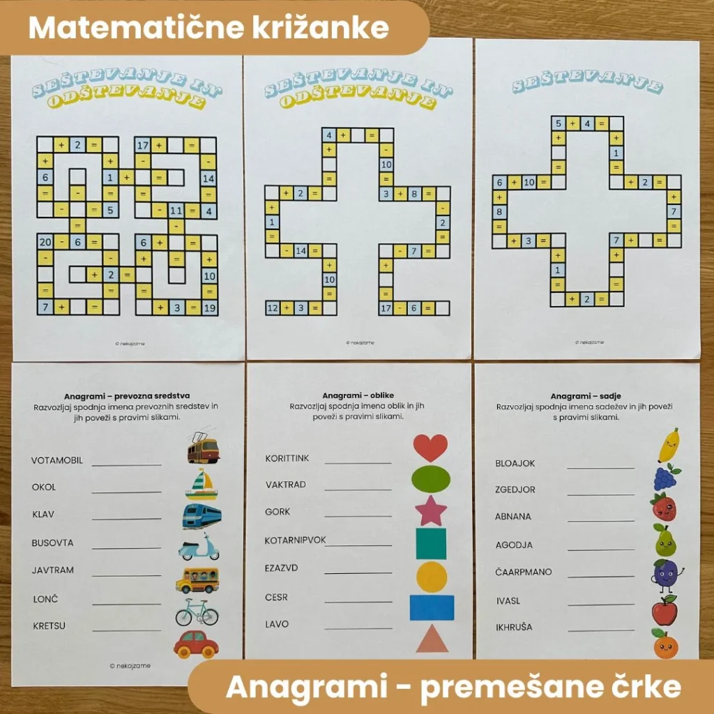 🔄 Anagrami (10 strani): Razvozlavanje premešanih črk ob ilustracijah krepi logično mišljenje in pravilno črkovanje.