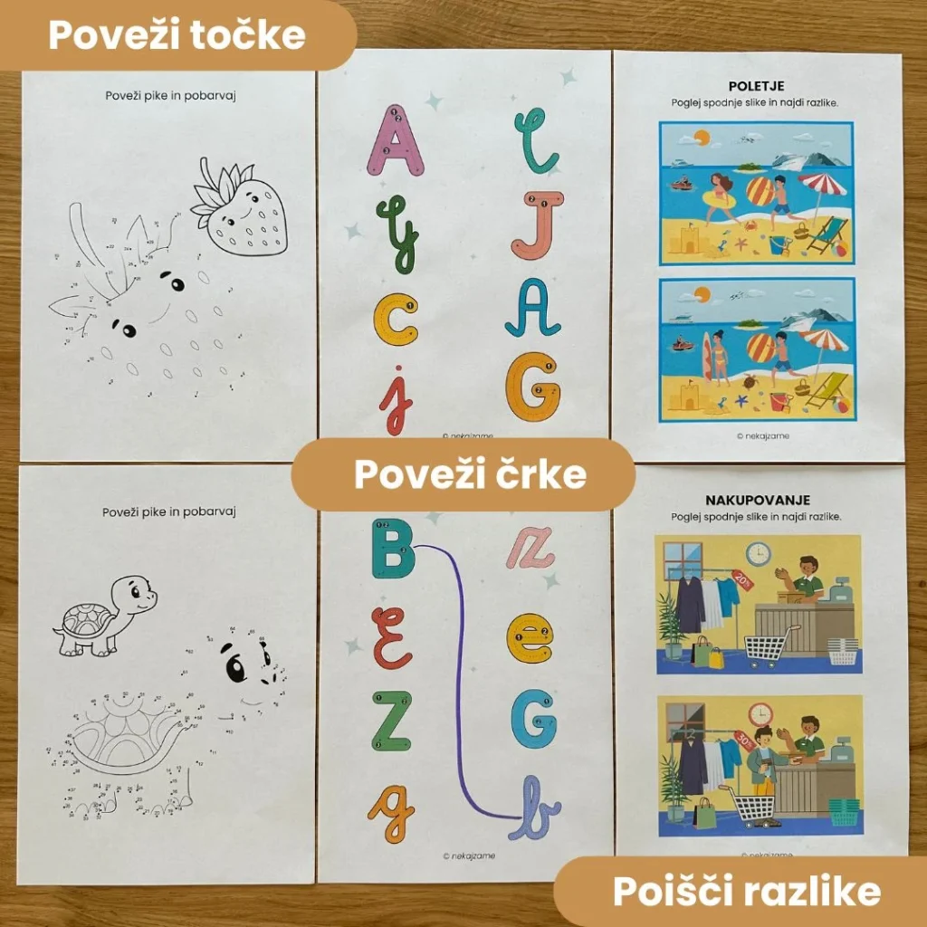 Otroški miselni paket: slovenska abeceda – pisane črke, križanke, uganke, poišči razlike in poveži točke (PDF–135 strani)